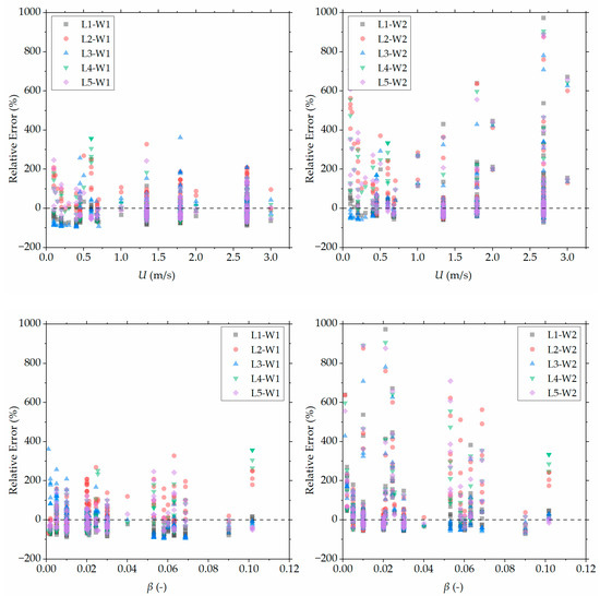 Aiming to further investigate the impact of certain physical parameters on the prediction accuracy of the investigated models, the calculated relative error for all ten model combinations is presented in Figure 4 as a function of wind velocity (Figure 4, top) and packing ratio (Figure 4, bottom). It is evident that an increase in wind velocity results in an overall decrease in the prediction accuracy of model W2, while W1 seems to be unaffected. Moreover, the accuracy of W2 is decreased at very low wind velocities. Regarding the effect of packing ratio, it seems to have no effect in W1, while it tends to decrease the accuracy of W2 with decreasing β.