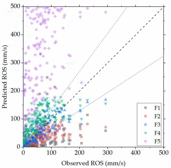 In Figure 5, ROS predictions using the field-developed models are compared to the respective measured values for the 166 test cases where external wind was present. In general, the predictions are significantly more scattered compared to the respective results of the laboratory-developed models obtained for the same fire tests (c.f. Figure 3). This is expected, since the field-developed models are strongly dependent on the specific fuel type used in the corresponding field tests, thus making their good performance in fire tests in which different fuel types are used quite a challenge. The F1 model significantly under-predicts the measured values, whereas the F5 model exhibits the strongest over-prediction. Model F4 is also slightly over-predicting. Model F2 shows a slight tendency for under-prediction, compared to that of model F1, while the F3 model results exhibit relatively smaller discrepancies.