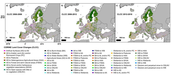 CORINE land cover change (CLCC) inventory for the (a) 2000–2006, (b) 2006–2012 and (c) 2012–2018 periods.