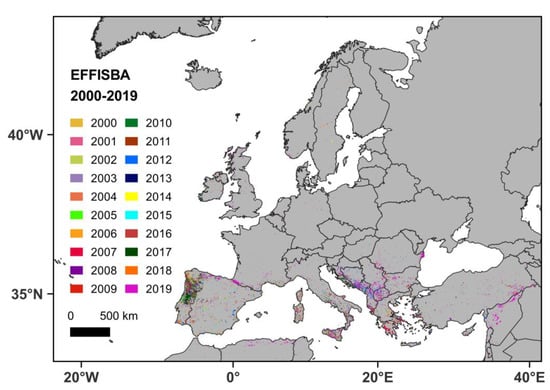 Other BA datasets are available based on satellite imagery, such as GlobFire [46], ESA FireCCI (https://climate.esa.int/en/projects/fire/, accessed on 30 September 2022) and Global Fire Atlas (https://www.globalfiredata.org/fireatlas.html, accessed on 30 September 2022) datasets; however, some of these datasets do not include small wildfire events, and, in other cases, they only cover a shorter period. Finally, we decided to use the EFFISBA dataset because it includes data for the entire study period (2000–2019) and is considered a reference BA dataset at the European level.