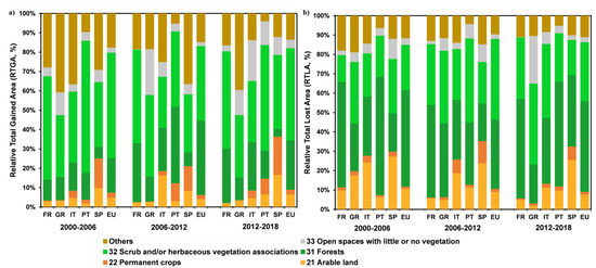Relative total lost area (RTLA, panel a) and relative total gained area (RTGA, panel b) based on CORINE land cover changes (CLCCs) for Europe (EU), France (FR), Greece (GR), Italy (IT), Portugal (PT) and Spain (SP), in the CLCC periods: 2000–2006, 2006–2012 and 2012–2018.