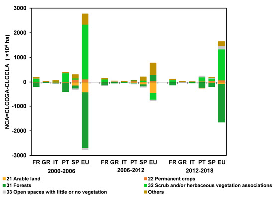 Net Changed Area (NCA), computed as the difference between the CORINE land cover changes (CLCC) Gained Area (CLCCGA) and the CLCC Lost Area (CLCCLA) for the CLC layers: 21—arable land; 22—permanent crops; 31—forests; 32—scrub and/or herbaceous vegetation associations; 33—open spaces with little or no vegetation; and others; for the spatial domains (France, Fr, Greece, GR, Italy, IT, Portugal, PT, Spain, SP and Europe, EU) and CLCC periods (2000–2006, 2006–2012 and 2012–2018) on the x-axis.