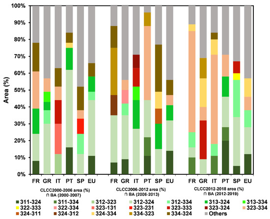 The analysis described in this sub-section is focused only on the top LULCC that occurred within BAs considering the European Forest Fire Information System Burnt Area dataset (EFFISBA) for each CLCC period across Europe and in each Southern European country (Figure 6).