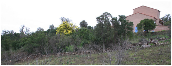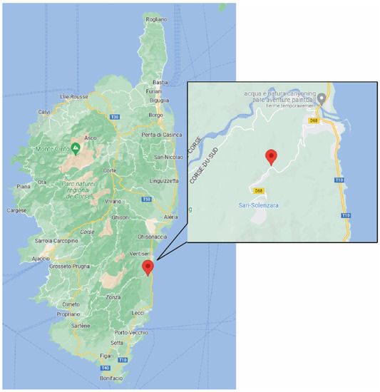 Corsica (France) provides a unique study area for fire risk research. On this island, it is estimated that among 360 villages or towns, about 200 are subject to wildfire risk and have a high probability that such events would affect people, homes and infrastructures [53]. The susceptibility to wildfires in this area is not only due to climatic change, but also to the vegetation characteristics (type and cover). Indeed, the vegetation growth due to land abandonment resulted in dense and flammable fuel [54]. The risk increases during summer periods with increasing population (doubles) in this popular touristic region. Population in agglomerations doubles and human frequentation expands in isolated fire-prone areas (outdoor activities in forests or mountains, nature campsites, car parking near seashore, etc.) [55]. Therefore, the site selected for this study, located in the commune of Sari-Solenzara (41°50′13″ N 9°22′23″ E) in the south-eastern region of Corsica (Figure 1), represents an illustration of some WUIs where the risk of wildfires threatening the lives and properties of the people is very significant. This site has the particularity of having a house at the top of an inclined terrain covered by a dense vegetation composed of high shrubs (Figure 2). The terrain slope was evaluated using GPS measurements on site. An average value of 12° was obtained along the main propagation axis of a most-likely fire.