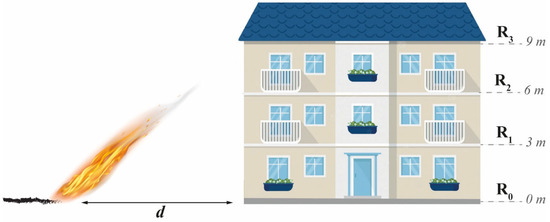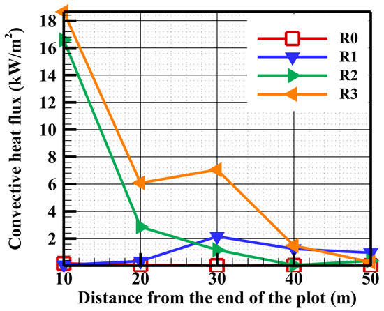 For instance, taking the example of the maximum tolerable value for the wood ignition (Qtot = 12 kW/m2), the safe separation distances to prevent damage evaluated graphically, considering only the radiative contribution, are 32.5 m, 21.8 m, 18.5 m and 17.3 m for the levels R0, R1, R2 and R3, respectively (Figure 10). Considering the convective heat transfer, these values increase to 32.6 m, 22.6 m, 19.3 m and 19.1 m, respectively (Figure 12). These results reveal that the radiation contribution was the dominant factor in evaluating the SSD at the different levels of the building. In addition, the results in Figure 11 show that the convection contribution was significant for a separation distance lower than 30 m and it increases globally with the building level height. Nevertheless, the convection at certain levels (R1 and R3 (Figure 11)) do not exactly match this tendency, and this may be due to the movements of the hot gases that do not follow a unique direction, as shown in Figure 7. Consequently, while the radiation globally follows an exponential decrease with distance for the different levels, the convective heat transfer is more dependent on the combination of the target elevation and position, because they both affect the contact between the hot gas flows and the levels of the building. Finally, regardless of the construction material type, the graphical evaluation of the SSD can be made using Figure 12 based on the thermal flux threshold that the target can withstand without damage.