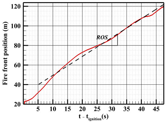 The rate of spread (ROS) represents one of the main parameters that characterize wildland fire behavior. Using FireStar2D [49,59], the ROS is evaluated based on the variation with time of the pyrolysis front position at the fuel bed surface when the fire front reaches a steady state.