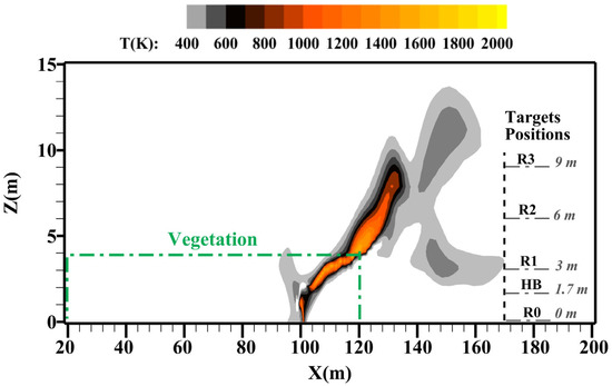 Instantaneous temperature field obtained using FireStar2D when the fire front reaches the end of the plot.