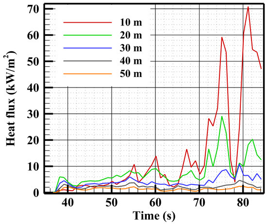Figure 8 shows the time evolution of the radiative heat fluxes, calculated with FireStar2D, for a person located at distances of 10, 20, 30, 40 and 50 m from the end of the plot.