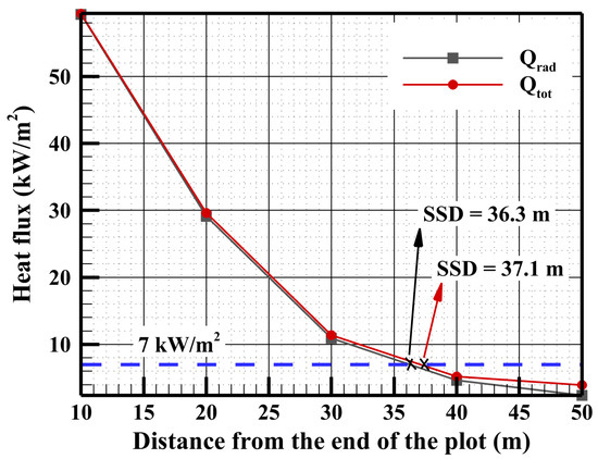 By introducing the convective heat transfer contribution, the total heat flux (Qtot), which is the sum of the radiative and convective heat fluxes, also follows an exponential pattern as a function of the distance between the flame front and the human body (Figure 9). In this case, the SSD value evaluated graphically is equal to 37.1 m. Therefore, considering the convection contribution increases the SSD by less than 2%. For instance, previous high-intensity surface fires conducted in shrubland vegetation show almost the same order of magnitude of convective heat fluxes received by fluxmeters (height < 3 m) located beyond 6 m from the plot end [42,43]. Knowing that the convection contribution is related to the contact between the flame and the target, it is then dependent on the flame inclination angle, and especially the orientation of the hot gases. Figure 7 shows that for a person with a height of 1.7 m, there is no significant contact between the flame and the target. Consequently, small convective fluxes were obtained with a dominance of the radiative heat transfer at different distances ahead of the fire front.