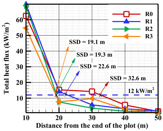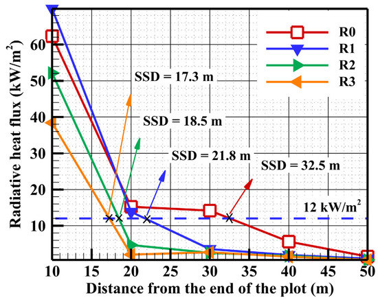 The evaluation of the SSD in this studied case, for both human bodies and buildings, is based on the radiative and convective heat fluxes received by these targets, when the flame front reaches the end of the vegetation area as shown in Figure 7. It is assumed that there is no surface fuel between the target and the end of the plot.