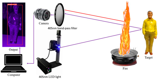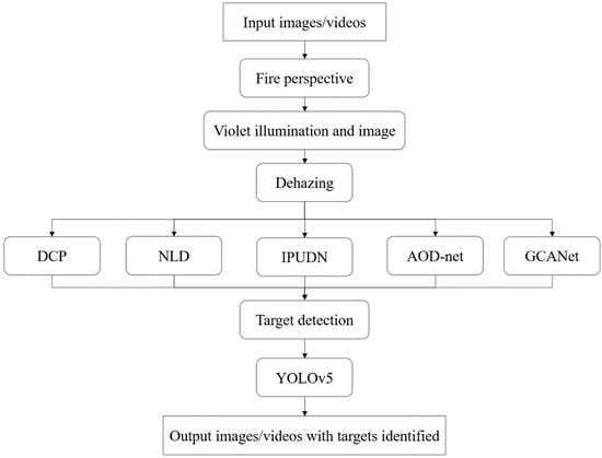 In this work, we propose a method combining narrow-spectrum violet illumination and imaging, deep-learning-based dehazing, and object detection algorithms to improve the visibility of targets behind or within a fire. The workflow of the current research is shown in Figure 1. The main contents of this work include the following:
