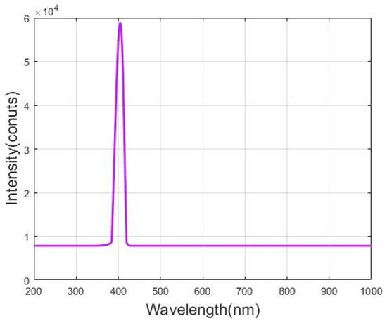 The experiments were conducted outdoors on sooty flames stabilized on a burner fueled with solid materials (wood, paper, cotton clothes, and their combinations, essentially covering common indoor fire sources in an actual fire disaster situation). As shown in Figure 2, for the violet illumination, a high-power LED light source (model CEL-LED100HA) was used, with a wavelength of 405 nm and a full width at half maximum of 20 nm. The spectrum of the violet illumination is shown in Figure 3. The outlet diameter of the LED beam was 50 mm, with a total input power of 240 W (±0.01%) and an optical output power of 20 W (±1%). The LED emitting light had a divergence angle of 24°, rather than being collimated. For imaging, a CMOS camera with a resolution of 2040 × 1086 pixels (model acA2000-165uc, manufactured by Basler) was employed. Moreover, a band-pass filter of 405 nm was applied in front of the camera to reduce the interference from the flame illumination while maximizing the signal from the reflected LED illumination.