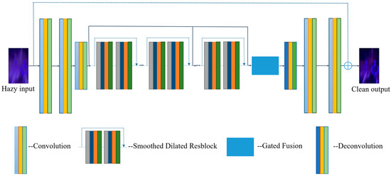 GCANet restores the clean image directly, without relying on traditional image priors such as dark channels and increased contrast. This network utilizes a smoothed dilation convolution and gated sub-network to eliminate the gridding effect and fuse features from different levels. The overall network structure of GCANet consists of three convolution blocks in the encoder part and one deconvolution block with two convolution blocks in the decoder part, as illustrated in Figure 4. Smoothed dilated resblocks are inserted between these two parts to aggregate context information without introducing gridding artifacts. The features from different levels are then fused by a gated fusion sub-network for improved image restoration.