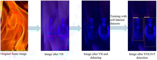 The representative results of the original flame images, violet illumination and imaging (VII), and deep learning algorithms for dehazing and target detection through fire are shown in Figure 5. It can be seen that people hidden behind the flames are completely invisible to the naked eye. After using 405 nm LED light and a matched band-pass optical filter, the outlines of the people could be roughly seen. Then, different dehazing algorithms were applied to the VII images to select the optimal algorithm, and the YOLOv5 object detection algorithm trained with a self-made dataset was used to identify the target.