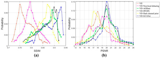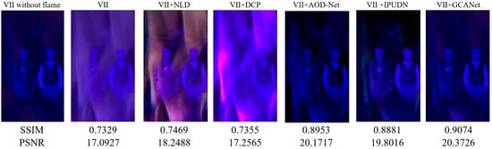 The qualitative and quantitative comparisons of the violet light illumination and imaging (VII) images under different haze removal methods are shown in Figure 6. VII without flames was applied as the ground truth. Compared to the VII image (second column), each method improved the quality of the image. It is also shown that the image evaluation indices (SSIM and PSNR) of a single image were increased when employing the dehazing algorithms. Specifically, SSIM was increased by 0.014, 0.0021, 0.1642, 0.1552, and 0.1745 under Non-Local Image Dehazing, Dark Channel Prior, AOD-Net, IPUDN, and GCANet, respectively, and the PSNR of each method increased by 1.1561, 0.1638, 3.079, 2.7089, and 3.2799, respectively. The statistical results of SSIM and PSNR for 427 images are shown in Figure 7. The statistical SSIM and PSNR of images processed by dehazing algorithms are distributed around higher indices, and GCANet has the best results among several dehazing algorithms.