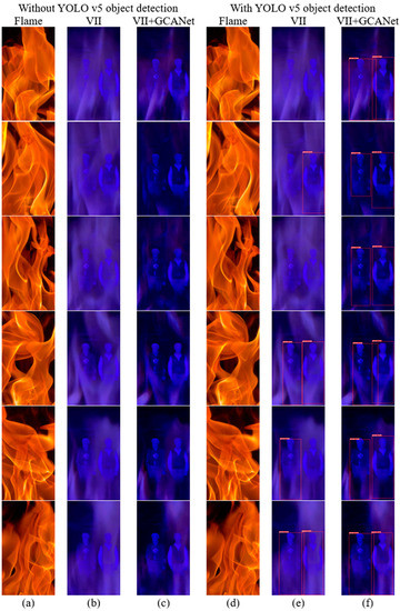In Figure 8, we also present snapshots obtained with and without object detection algorithms for the original fire images, the images with VII, and the images with combined VII and GCANet. It can be seen from Figure 8a that the people hidden behind the flames were blocked when the images were taken without VII. After using VII, the outlines of the people, shown in Figure 8b, could be roughly seen. However, the visibility was not sufficient due to occlusion from soot and smoke. As is shown in Figure 8c, the visibility improved significantly and the figure could be clearly seen after the image was processed by GCANet. Figure 8d–f show the results of YOLOv5 detection. We can see that no target could be identified when the images were shot without any LED light or filter. After using 405 nm LED light and a matched band-pass optical filter, a few targets could be identified. After images were processed by GCANet, the accuracy and probability of identification were both improved by a large margin.