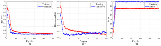 The training results of YOLOv5. (a) Box loss; (b) objectness loss; and (c) precision and recall.