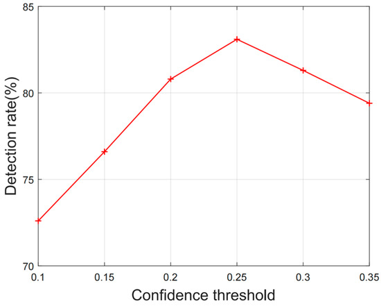 After 200 epochs, the training and validation losses appeared to be stable, indicating that the network converged. The model was also improved in terms of precision and recall. Furthermore, we evaluated the sensitivity of the detection rate to the confidence threshold of YOLOv5. Figure 10 presents the comparison of the detection rates of images processed with GCANet under different confidence thresholds with YOLOv5 self-trained weights. The default confidence threshold of YOLOv5 is 0.25. With the confidence thresholds set to 0.1, 0.15, 0.2, 0.25, 0.3, and 0.35, the detection rates are 72.6, 76.6, 80.8, 83.1, 81.3, and 79.4, respectively. Decreasing the confidence threshold increases the number of detected target frames, but also increases the probability of false detection. Conversely, increasing the confidence threshold decreases the number of detected target frames. Thus, we chose 0.25 as the optimized confidence threshold of YOLOv5.