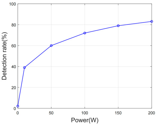 As the incident light intensity may also influence the performance of this method, in Figure 11, we compare the detection rate of the best dehazing methods under different violet light intensities. It is shown that the recognition rate decreases with the decrease in the violet light intensity. This is because the people behind the flames are not illuminated sufficiently. At the same time, we also studied the influence of the fire wall thickness on the detection rate. It was shown that with the increase in the fire wall thickness, the detection rate also decreased. The initial fire wall thickness was 10 cm. When the fire wall thickness was increased by 10 cm, the detection rate decreased from 83.1% to 50.4%. It should be noted that the local violet flux of the object can be further enhanced by reducing the divergence angle of the light while maintaining the optical output of the LED.