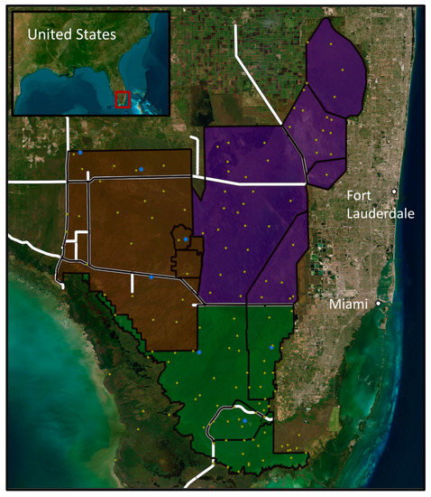 Significant draining for agricultural conversion occurred in South Florida during the 1800s and 1900s, with smaller amounts of conversion thereafter; currently, South Florida fruit groves and pastureland are the second largest land cover class following protected areas [24]. The Everglades National Park (Everglades) and Big Cypress Preserve (Big Cypress) cover 9000 km2 of southern Florida. When combined with the South Florida Water Management District (SFWMD) lands to the north and east, the study area covers 12,500 km2 (Figure 1). This area, also known as the Southern Greater Everglades, spans multiple ecoregions from upland pines and deep cypress strands in northern Big Cypress to sawgrass-dominated marshes of the coastal Everglades [25].