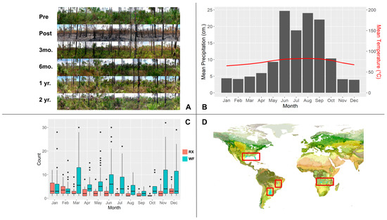 (A) Photo series visualizing the quick regeneration of understory dominated by grasses and shrubs (Adapted with permission from [30]. 2008, U.S. Fish and Wildlife Service Southeast Region). Images show in descending order: pre-burn, immediately post-burn, 3 months post-burn, 6 months post-burn, 1 year post-burn, and 2 years post-burn. (B) Mean monthly precipitation and mean temperature for Everglades National Weather Station from 1980–2017 [31]. (C) Paired boxplot of the number of monthly wildfires and prescribed fires in BICY from 1980–2021. The average prescribed fire (RX) is ~1000 acres with ~100,000 acres burned annually; the average wildfire (WF) is ~3700 acres with an average of ~75,000 acres burned annually. (D) Global map highlighting other subregions with similar topography, vegetation, and climate regimes [32].