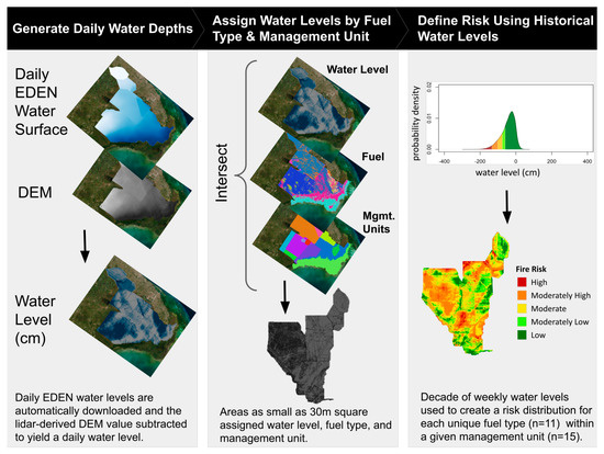 Mapping fire risk in South Florida depends on spatially varying water levels, fuel characteristics, and topography. When surface water levels recede below the lowest topographic features (cypress strands, marshes, etc.), the ecosystem loses its natural, wetted fire breaks, and landscape-level fire risk increases. We developed a geospatial method to generate daily, categorical fire risk maps; the maps visualize low-to-high risk areas using a newly developed 100 m DEM, modeled water levels, fuel types, and fire management units. We assigned fire risk by creating a water level distribution for each unique combination of fuel type and fire management unit; fire risk was then assigned for each pixel based on risk percentiles commonly used by fire management agencies. Assigning risk based on unique fuel types and management units helped avoid over- or under-assigning fire risk that may occur when applying landscape-level “average” risk relationships. Daily maps also incorporated (1) energy release component data to better estimate fuel moisture and (2) historical burn footprints to reduce risk in recently burned areas. Our data-driven approach generated at management-relevant spatial scales may enable more informed prescribed burn planning and may increase the efficiency of staff and resource allocation across the landscape on high-wildfire-risk days.