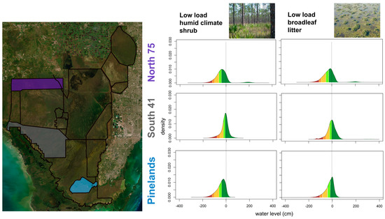 We used 15 management units to delineate areas of the landscape with similar hydrological conditions that are likely to carry fire similarly during a wildfire or prescribed fire. Depending on the location, managers may expect the same fuel type in two different management units to behave differently or require different risk classifications. For example, a comparison of the water level values at the “low” to “moderately low” risk threshold for low load humid climate shrub fuels in the North 75 and South 41 management units shows the variability in water levels within the same fuel type across management units. In North 75, the low- to moderately-low-risk threshold occurs at approximately the −25 cm water level, whereas the South 41 threshold is much closer to the 0 cm water level (Figure 4). Small shifts in the water level distributions affect data-derived risk percentiles, and these transition points are customized to more localized hydrologic conditions when management units are used to subdivide the landscape.