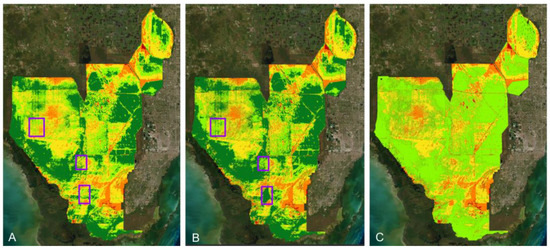 Three model outputs for 18 April 2019. We randomly selected an April day within the last five years because April often shows the landscape transition from moderate to higher fire risk. (A) Output risk map based solely on water level risk percentiles within each fuel type and management unit. (B) Risk assignments from map (A) with risk reductions in areas that experienced a wildfire or prescribed fire within the last three years. Purple boxes highlight sizable risk reductions due to historic fires. (C) ERC modified risk from map (A) due to a relatively high ERC (28) value.