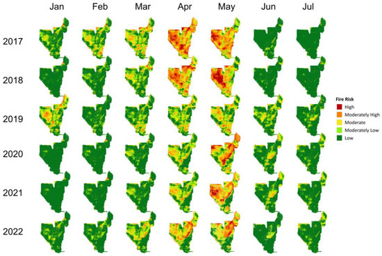 Six years (2017–2022) of risk maps for the 15th of each month (January–July). January and February reliably support prescribed fire operations with limited precipitation and overall lower risk. March shows the transition from the prime months to conduct prescribed fires to April and May which mark the onset of wildfire season. June and July show decreased risk due to the return of more consistent rainfall that continues through late fall.