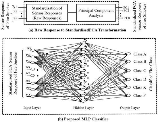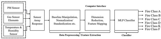 | [10] | Used commercially available smoke sensor devices and developed three ANN models for smoke detection during fire hazards. They did not attempt to classify various classes of fire. | We have developed our gas sensor array-based system, used three MLP models, and classified all six classes of fire for real-time applications. |