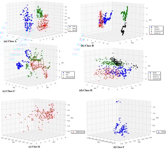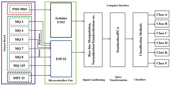 | [11] | Used e-nose to detect and classify cotton, beech, and printed circuit boards (PCBs) from their burning smells using the LDA method. | Our e-nose system detects all six types of fire classes using PCA and SPCA for pre-processing the dataset. In comparison, we designed and tested 08 different types of classifiers to achieve high-performance classification. |
