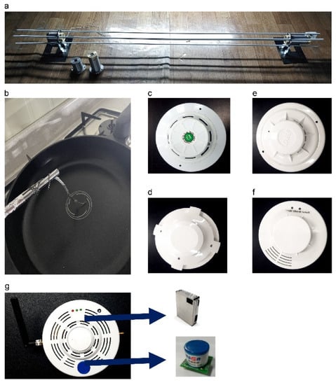 - Thomas, G.C.; Chernovsky, A. Technical Note, Smoke Alarm Performance in Kitchen Fires and Nuisance Alarm Scenarios; NIST TN-1784 Report; National Institute Standards and Technology: Gaithersburg, MD, USA, 2013. Available online: https://nvlpubs.nist.gov/nistpubs/TechnicalNotes/NIST.TN.1784.pdf (accessed on 21 January 2013).