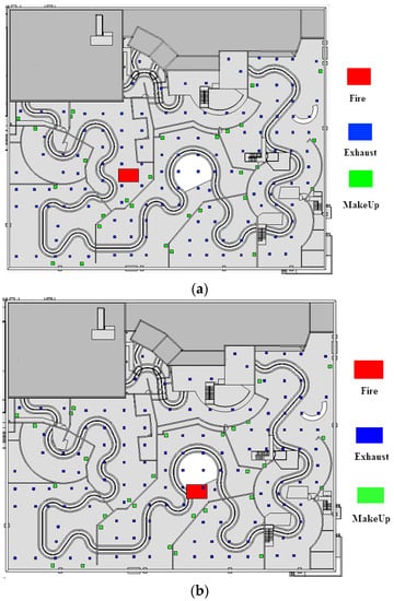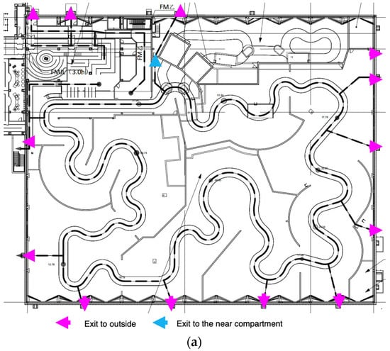 Figure 3. Distribution of emergency exits. (a) First floor, (b) second floor.