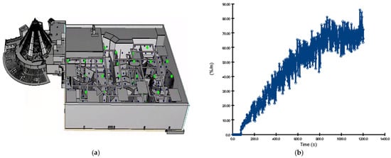 Analysis model and result of detection time simulation. (a) Detection simulation model, (b) smoke concentration result of the simulation.