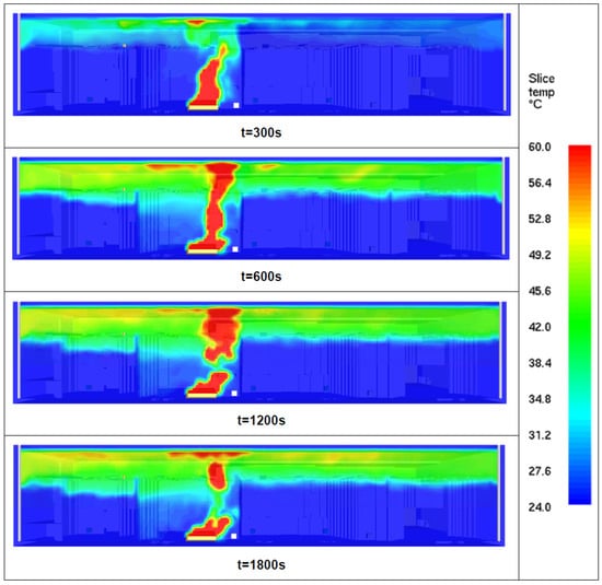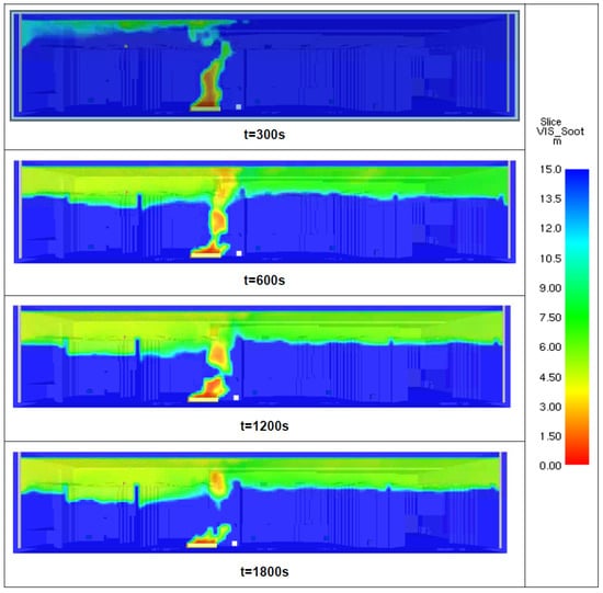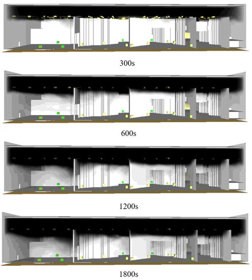 The flashover phenomenon shows that the heat of fire on the human body mainly comes from the thermal radiation of smoke, so the temperature of smoke has a great impact on personnel evacuation. The research shows that the human body can tolerate for several minutes under the thermal radiation intensity of less than 2.5 kW/m2 []. Through calculation, the heat radiation of 200 °C smoke is about 2.5 kW/m2. Therefore, the radiation intensity can be equivalent to the smoke with a temperature of 200 °C.