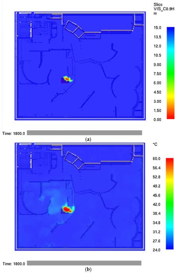 In the fire, it is necessary to ensure that persons are in the air with a clear height below the smoke, as shown in Figure 5. The temperature of the air has a certain impact on the human body. Experiments have shown that breathing overheated air will lead to thermal shock and respiratory burns, because the absolute humidity of the air in the fire will be much higher than the environment. The harm of saturated air to the human body is much greater than that of dry air. The research shows that 60 °C can be considered as the maximum temperature of inhalable air in the fire.