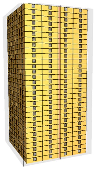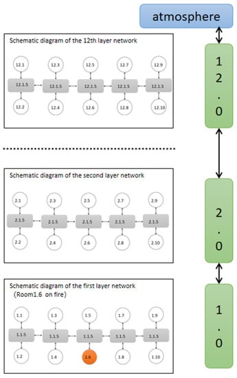 23]. In the figure, red nodes represent ignition nodes, dark red nodes represent horizontal passage nodes, mainly used for corridors, blue nodes represent atmospheric environment nodes, green nodes represent vertical passage nodes, and yellow nodes represent conventional room nodes. In actual high-rise buildings, there may be an extensive network of nodes, which can make the visualization results challenging to distinguish. Therefore, only the first five layers are displayed for ease of presentation. To simulate the fire scenario, we selected Room (1, 4) as the ignition room, with only six room nodes per floor. The simulation results are presented in
