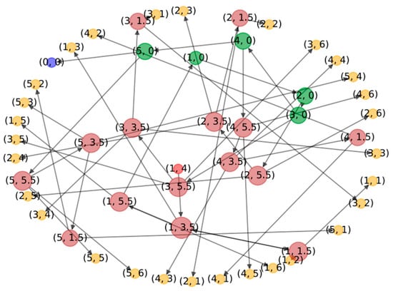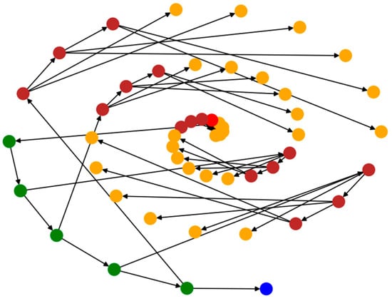 Figure 9. White nodes represent rooms, gray nodes represent corridors, red nodes represent the room on fire, green nodes represent staircases, and blue nodes represent the atmosphere. For ease of display, only the first five layers are shown.