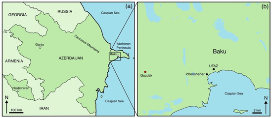 (a) Map of Azerbaijan showing neighbouring countries, and the location of the Absheron Peninsula, the Caucasus Mountains, and Baku (latitude and longitude of Baku: 40.4093° N, 49.8671° E). (b) Zoomed-in map of the Baku area showing the location of the quarry at Guzdak (red circle) and the Icherisheher.