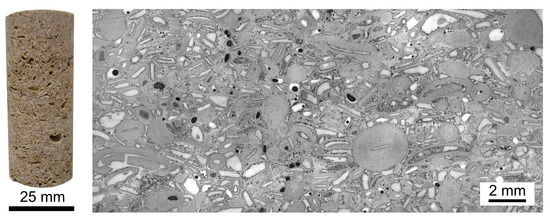 Photograph of a 25 mm diameter core sample (left) and an optical microscope image of the studied limestone (right).