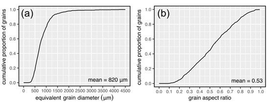 (a) The cumulative proportion of grains as a function of equivalent grain diameter. The mean grain size (820 μm) is also shown on the panel. (b) The cumulative proportion of grains as a function of grain aspect ratio (the minor grain axis divided by the major grain axis). The mean aspect ratio (0.53) is also shown on the panel. The total number of grains analysed = 623.