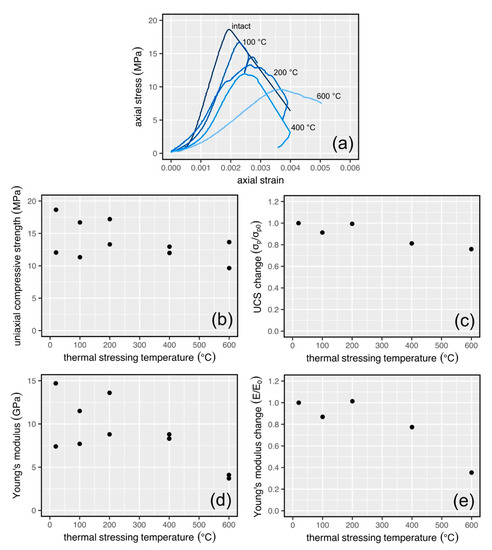 UCS and Young’s modulus are shown as a function of thermal stressing temperature in Figure 8. We plot in Figure 8 the absolute value of UCS (Figure 8b) and Young’s modulus (Figure 8d) (data are also available in Table 3). We also provide the relative change of UCS and Young’s modulus in Figure 8c,e (here, we used the average value of the two measurements for each thermal stressing temperature). We also provide representative uniaxial stress-strain curves for experiments performed on samples from each thermal stressing temperature in Figure 8a. We find that UCS (Figure 8b,c) and Young’s modulus (Figure 8d,e) decrease as a function of increasing thermal stressing temperature. For example, at the maximum thermal stressing temperature, UCS (Figure 8c) and Young’s modulus (Figure 8e) decreased by ~20% and ~60%, respectively.
