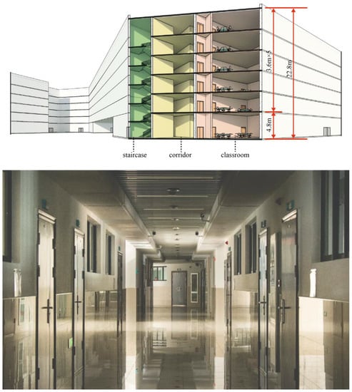 On university campuses, teaching buildings are collective living spaces where students study and where they spend most of their time (4.5 h on average) []. In addition, university teaching buildings are characterized by a relatively high density of people indoors, usually consisting of 50–180 students sharing classes in one room in China. In addition to able-bodied and young people, there are some physically handicapped and elderly people in the teaching building. According to the survey [,], 0.145% of students are disabled, and 0.446% of college students have sports injuries that affect their normal walking ability for a period of time. Moreover, with the aging of society, older teachers and researchers have become a non-negligible category of the population using teaching buildings. However, it is observed that many teaching buildings do not provide appropriate supporting facilities for these vulnerable people to help them evacuate smoothly in times of emergency because of their relatively old construction age.