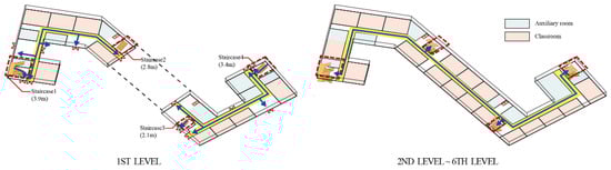 According to the HPEA scheme, each classroom on each floor should have its own corresponding evacuation staircase, as shown in Figure 7c. This maximizes the equal number of evacuees per unit width (d) of each stairway and ensures that everyone leaves at the same time. The 90 rooms that use the staircase are distributed equally across the six staircases, where Wi is the width of each staircase and W is the total width of all stairs []: