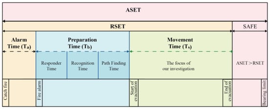In addition to the fire resistance of a building, the fire safety performance of a building includes the ability to evacuate in the event of a fire. Protecting human life in the event of a fire is paramount, which requires that all evacuees reach safety before they are affected by the fire. Figure 4 shows two indicators: required safe evacuation time (RSET) and available safe evacuation time (ASET), which are often used to assess the safe evacuation capacity of a building. ASET > RSET is considered safe [].
