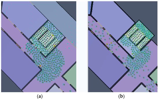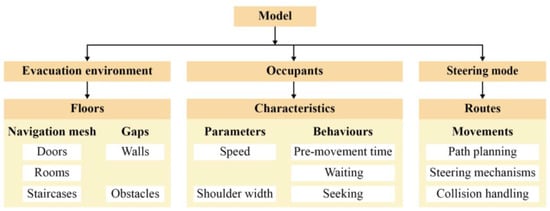 In this study, Pathfinder was used to simulate the timing of individual evacuations. Figure 6 shows a screenshot of the model created in Pathfinder, which simulates crowd evacuation paths and times based on the evacuation environment and personal behavior. To regulate how people move, Pathfinder’s steering model incorporates path planning, guidance systems, and collision handling. If the interval between an individual’s path and the nearest point is greater than a predetermined threshold, a new path can be generated to adapt to the new evacuation environment. The steering model is used in this study because it is closer to the emergency evacuation behavior of a crowd. The algorithm of the steering model is given by the following equation [].
