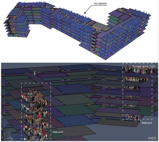 As mentioned earlier, although both stairs and elevators are common means of transportation, some countries, including China, do not allow the use of elevators to escape in case of fire []. Therefore, this paper only considers the use of stairs or other building elements, such as ramps, for evacuation.