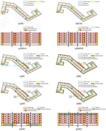 Figure 7a illustrates a typical evacuation scenario called NE. The number of mobility-impaired people in each classroom is randomly distributed, and there are 72 students and one teacher in each classroom.