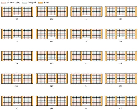 The VPE scenario is a vertically phased evacuation scenario in which we attempt a two-phase evacuation of the academic building. First, we evacuated three of the floors, and after a delay of 50–300 s, we conducted a second evacuation to clear the remaining three floors. We assigned numbers to the floors, starting with 1 for the ground floor, 2 for the second floor, and so on, to compare the advantages and disadvantages of each scenario. For example, scenario name 123 describes the first evacuation from the first, second, and third floors. According to Figure 8, the VPE scenario contains 20 cases (123, 124, 125, 126, 134, 135, 136, 145, 146, 156, 234, 235, 236, 245, 246, 256, 345, 346, 356, and 456). Evacuation time is positively correlated with delay time. We will calculate the fastest evacuation time for each case.