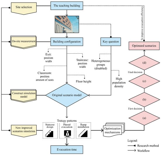 The following are the precise goals of this work: (1) We anticipate doing a thorough investigation of the factors influencing the teaching building’s evacuation performance based on the projected user population composition and individual building components. (2) It is aimed to find the best optimal solution for the teaching building to increase evacuation performance through a thorough analysis and combination of design and management solutions. (3) Compared to the baseline, the maximum possible improvement of evacuation performance is expected to be obtained. (4) In addition, the methodology suggested in this work is to be adaptable to other similar buildings. The remainder of this paper is arranged as follows. In the Section 2, the overall framework of optimized strategy based on pathfinder simulation is introduced in detail. In the Section 3, a teaching building is chosen as a case study for analysis, and the results are discussed. The last section summarizes this work.